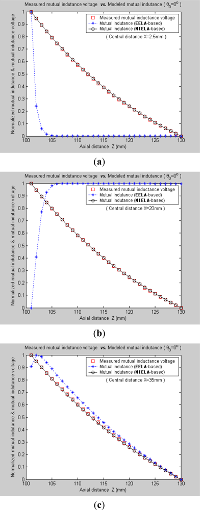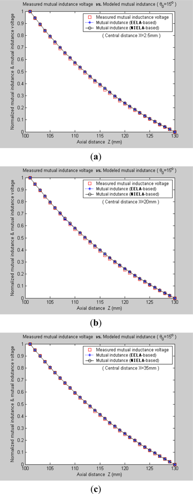 Figure 11(a–c) further plot the normalized curves of the measured mutual inductance voltage, NIELA-based mutual inductance, and EELA-based mutual inductance respectively according to Figure 9. It can be seen that, under such stringent point to point spatial comparison, the NIELA-based mutual inductance still shows good tracking of the measured mutual inductance voltage, which further increases our confidence in using the proposed NIELA model to predict both horizontal displacement and vertical displacement variations for the II-type sensor. However for EELA, so long as the convergence conditions are not met, its normalized curves of mutual inductance show little shape similarity to the measured one, so the EELA model becomes invalid and unqualified for II-type sensors under such instances. As can be seen from Figure 10, under cross-axial state, both NIELA-based and EELA-based mutual inductance match the actual mutual inductance voltage very well. In the same way, we have further plot the normalized curves from Figure 10 and labeled them as Figure 12, which shows that even under such stringent point to point spatial comparison, these three normalized curves, that is, NIELA-based predictions, EELA-based predictions and sensor prototype-based measurement results, are almost completely overlapped wherever X = 2.5 mm, 20 mm or 35 mm.