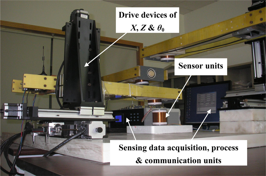 To verify the above analysis and to test the performance of the proposed NIELA method on evaluating of the mutual inductance versus the horizontal displacement and vertical displacement between two adjacent sensor units for a II-type sensor, we conducted a series of experiments and comparisons using a sensor prototype and some related devices, which include the sensor’s axial, horizontal displacement and vertical displacement drive devices, axial angle measurement unit, sensing data acquisition, processing, communication and display unit, etc. The sensor prototype mainly includes two adjacent integrated deep displacement sensor units (Solenoid I and II) and a deep displacement measuring central processing unit. Under the control of the central processing unit, the sine input voltage Ui can be automatically generated on Solenoid I, the corresponded mutual inductance voltage Uo across Solenoid II and the axial distance Z, central distance X and axial tilt angle θ0 between them can be automatically measured and recorded in real time and further transmitted to a remote or local comprehensive processing center for detailed process through RS-485 or wireless communication. X, Z and θ0 can consecutively adjusted by the sensor’s axial, horizontal displacement and vertical displacement drive devices. The detailed sensor fabrication process and supported devices arrangement have been introduced before [] and a photograph of the experimental setup is shown in Figure 4.