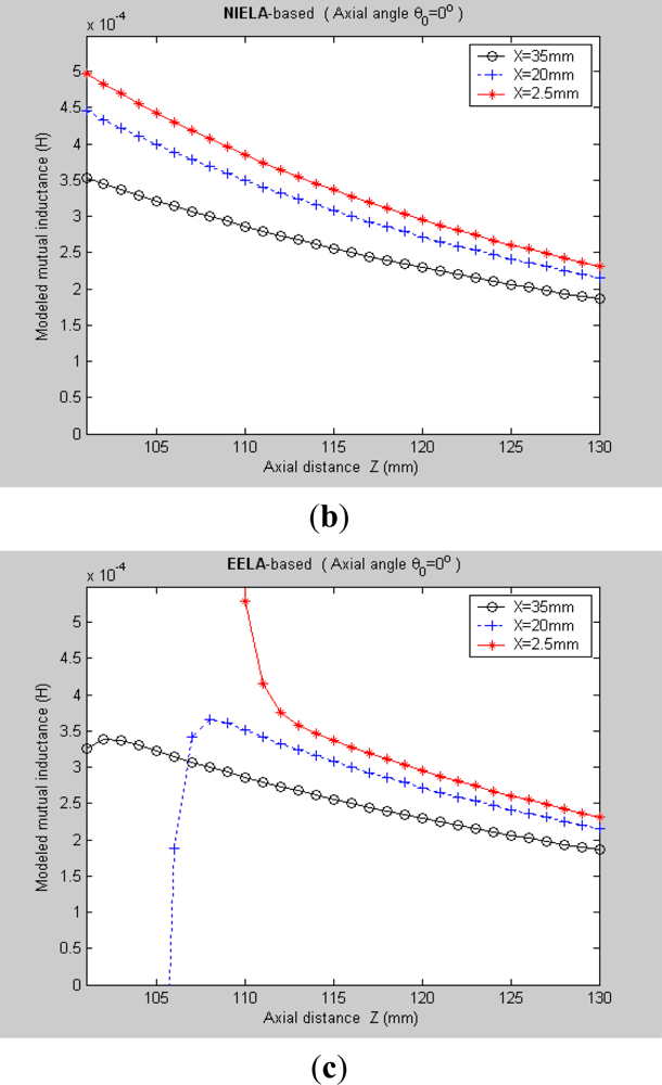 It is noted that, only with the premise of convergence could EELA be correctly apply to theoretical modeling for the deep displacement sensor. That is, when Z is smaller than a certain fixed value (i.e., convergence limit), the convergence condition for EELA could no longer be satisfied, so the predicted mutual inductance is meaningless and invalid, which has been clearly demonstrated by Figure 9(c). Meanwhile, the NIELA-based 2-D theoretical curves [Figure 9(b)] are seen to be quite in agreement with the experimental one [Figure 9(a)] wherever X = 2.5 mm, 20 mm or 35 mm.