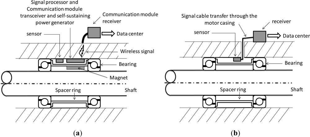 This study applies a fault diagnosis system to the core of the spindle system to monitor the vibration frequency inside the spindle system, which differs from traditional systems where the metal case of the spindle system must be pierced to enable monitoring. Figure 1(a) shows the schematic view of the spindle monitoring system with a wireless and powerless sensing node; Figure 1(b) shows the installation of the traditional system of vibration monitoring. With the traditional monitoring method, a hole must be created in the metal case of the spindle, and special precautions adopted to prevent any damage to the signal cable and the power cable during assembly, because damage to the signal cable may lead to incorrect information regarding vibrations. The more sensor types used, the more complicated the wiring is. Therefore, this study proposes the innovative concept of placing the wireless and powerless sensing node in the spindle. In this approach the rotor includes a permanent magnet that drives the power-generating module of the wireless and powerless sensing node. The WPMS is placed at the spacer ring between the bearings to monitor the vibration signals of the bearing using the nearest location to the bearing. This fault diagnosis system monitors the operational status of the spindle without requiring power cables and signal cables. Distinct from traditional systems, the proposed WPMS conducts system monitoring without damaging the external structure of the spindle, which not only reduces the monitoring system costs and improves the fault identification rate, but also enables modularized production and reduces the complexities of assembly and maintenance.