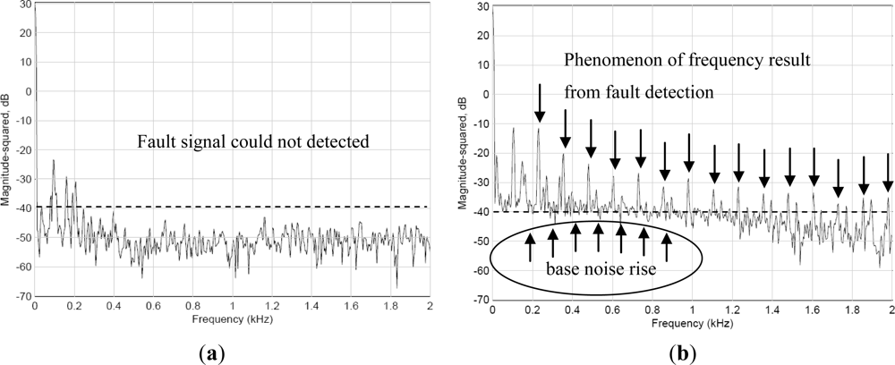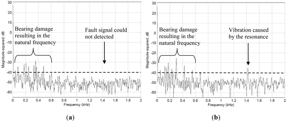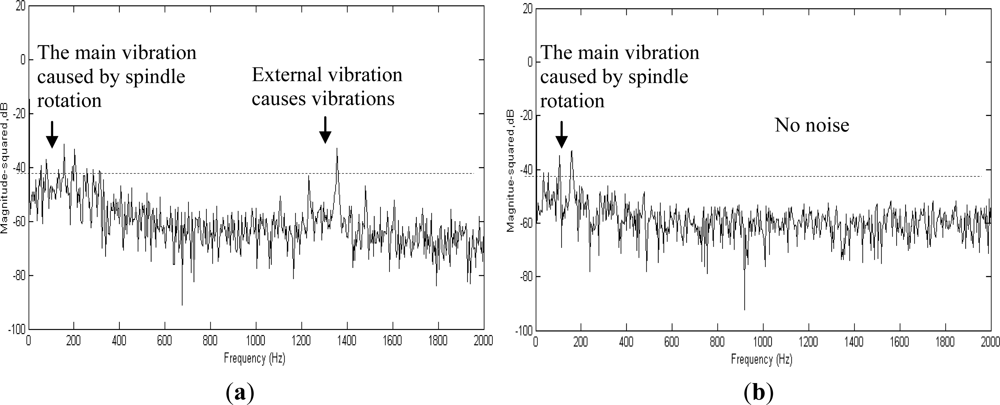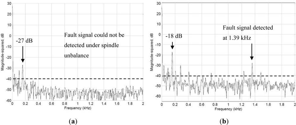 Figure 9 shows the vibration spectrum detected when the spindle revolves at 4,000 rpm. Figure 9(a) shows the signals of the spindle detected outside the spindle case, and Figure 9(b) shows the vibration signals detected by the WPMS. A comparison between the two outcomes revealed that the vibration power detected outside the case using the traditional method was −27 dB, whereas that detected using the WPMS was −18 dB. Clearly, when an imbalance occurs in the spindle system, the amplitudes of the vibration increase, increasing the power of the main vibration frequency. Additionally, fault signals emitted at 1.39 kHz are also detected using the WPMS, which is the secondary cause for faults resulting from poor concentric bearing movements because of the system imbalance.