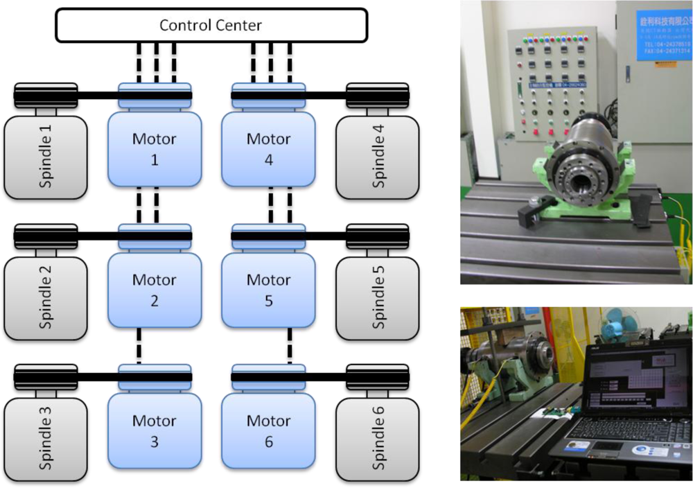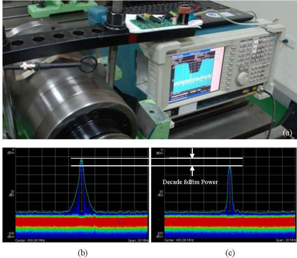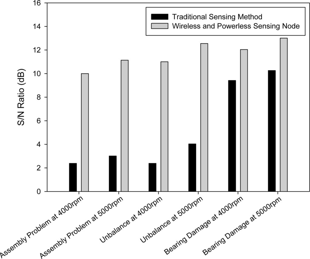 Using a monitoring system to assess the symptoms of mechanical systems prior to the occurrence of faults can effectively prevent sudden system shutdowns and any consequent impact on productivity [1]. A wide variety of monitoring methods target various sensors for machine tools, such as temperature sensors, displacement sensors, speedometers, and accelerometers [2]. The most commonly referenced indicator of damages to the bearing of the machine tool spindle is the vibration signal. The magnitude and frequency of vibration can be used to identify the cause of system failure, such as bearing damage, impeller failure, sealing failure, and mixed failure spectrum [3,4]. With advancements in industrial technology, increasingly diverse methods are developed to analyze the faults of machine tools, including identifying the fault cause of a single component even with multiple vibration sources [4]. Subsequently, additional methods can be used to analyze system faults, such as an artificial neural network, decision tree, and fuzzy fault diagnosis [5–8]. Apart from identifying the type of system failure, a number of studies have examined the identification of a fault cause in systems with a low SNR [9,10]. To diagnose and analyze the cause of faults in systems with a low SNR, a complex mathematical system must be applied; however, a low SNR still cannot eliminate the possibility of identification errors. This study is based on prior research by author Lee, titled Wireless and Powerless Sensing Node System, and published by Sensors in 2008 [11]. Lee’s system adopts wireless and powerless sensing node technology, and transmits signals across a metal case of a certain thickness. The sensor can be installed inside the core of the spindle to obtain vibration signals near the fault source. This study develops a Wireless and Powerless Monitoring System (WPMS) using the key technology of signal transmission across a metal case. The actual fault diagnosis occurs inside the spindle system. Using lengthy tests and adjustments, three faults were identified. When applied to an actual spindle production platform, the proposed system could improve the SNR of system monitoring, as well as the diagnosis rate of system faults.