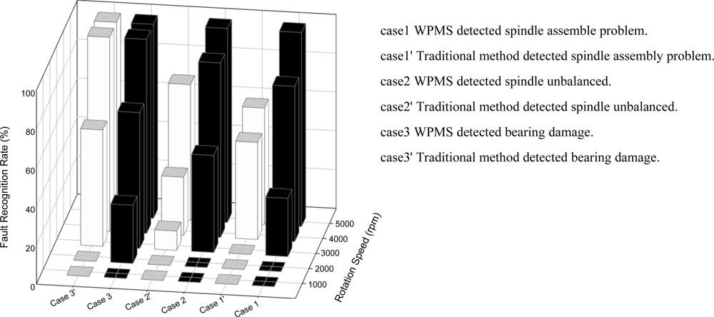 The WPMS discussed in this study was implemented in the testing and monitoring platform of a spindle production line. By conducting tests when the spindle revolved at various speeds between 1,000 to 5,000 rpm through a running-in system, the WPMS and the traditional fault monitoring system were examined extensively. Figure 12 displays the two methods of fault diagnosis, and each method was used on 10 spindle systems for fault identification. The results of Figure 12 indicate that greater revolving speeds render higher identification rates when used to monitor whether the spindle system operates normally, and that the WPMS has a higher identification rate than the traditional fault diagnosis method when revolving at a low speed. Under the same speed of 4,000 rpm, the minimum identification rate is 30% using the traditional method, whereas the minimum identification rate is 80% using the WPMS. Moreover, 100% of system faults are identified using the WPMS in the running-in system at the production line when the spindle revolves for a complete range from 1,000 to 5,000 rpm. This result indicates that the WPMS applied in the production line for fault recognition provides higher recognition rates.