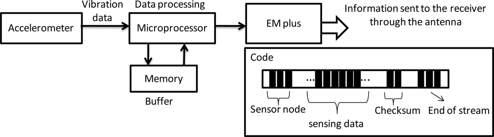 In the article titled Wireless and Powerless Sensing Node System it was reported that transmitting data across the 20 mm metal case using EM with the communication module results in a 5.3 dBm loss. This study discovers that the industrial RFID chip nRF905 can produce a maximum transmission power of 10 dBm, and the chip itself, which comprises a frequency synthesizer, power amplifier, crystal oscillator and modulator, works on two configurable frequencies, 430 MHz and 433 MHz. In addition, the data is demodulated upon reception. Manchester encoding and demodulation is automatically conducted during the transmission and reception. The encoding and demodulation also ensure the accuracy of the data transmission, and protect packets from distortion. Based on these considerations, the RFID chip nRF905 is adopted as the chip for data transmission in this study. The specifications of the chip are provided in Table 2.