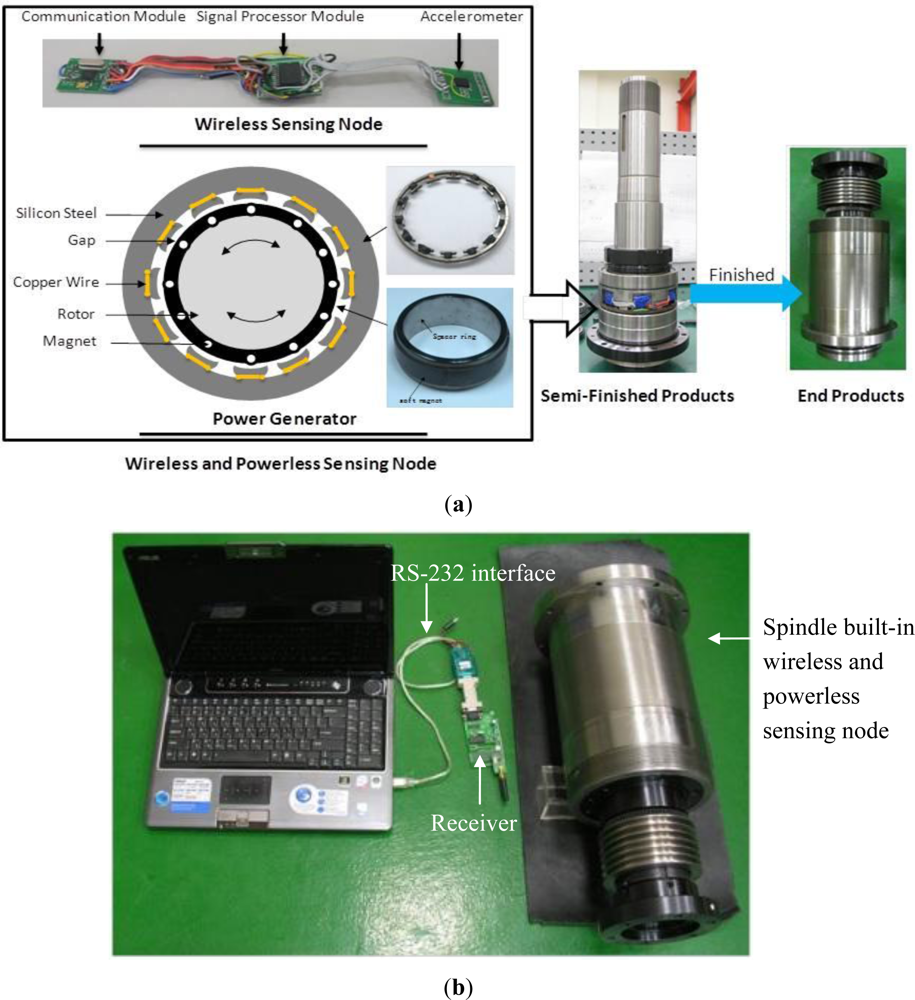 The WPMS includes a wireless and powerless sensing node and a power generator. The wireless and powerless sensing node is an integrated system comprising a sensor, microcontroller, RF chip, and memory, and manages data using the bench mode, where the transception of data is conducted through the metal case of the spindle. The wireless and powerless sensing node and the power generator are installed at the spacer ring of the spindle, which is placed between the front and rear bearings of the spindle. The system components for assembling the semifinished product and the final product are shown in Figure 3(a). The blue parts in Figure 3(a) denote the wireless and powerless sensing node encapsulated by insulated packaging materials. The external receiver of the system is a receptive module comprising a RFID chip nRF905, microprocessor, and RS-232 conversion chip. The module receives the data sent by the WPMS, and transmits the data to the computer for data recording. The complete system architecture is shown in Figure 3(b).