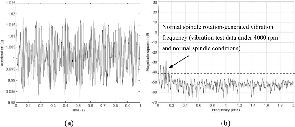 In this study, the revolving speed of the spindle is maintained constant at 4,000 rpm, because faults are more easily identified when operating over 4,000 rpm. The time domain of vibrations when the WPMS monitors the vibration of the spindle under normal conditions is shown in Figure 7(b). Because the cause of spindle faults are not easily analyzed through vibration signals in the time domain, data sampled at a frequency of 0.25 ms/time were transferred to a frequency domain using Fast Fourier Transforms (FFT), and the number of sampling points was set at 1,024. The resulting frequency domain is shown in Figure 7(b). The spindle of the machine tool used in this study generates a vibration frequency of 180 Hz under normal conditions and at a speed of 4,000 rpm, which is a resonance generated by the revolving spindle. Under different revolving speeds, the vibration increases as the revolving speed increases. Other low frequencies result from the low-frequency vibration generated by the motor of the testing platform. A normally functioning spindle system should not produce any high-frequency vibrations apart from the primary vibration frequency generated during normal operations.