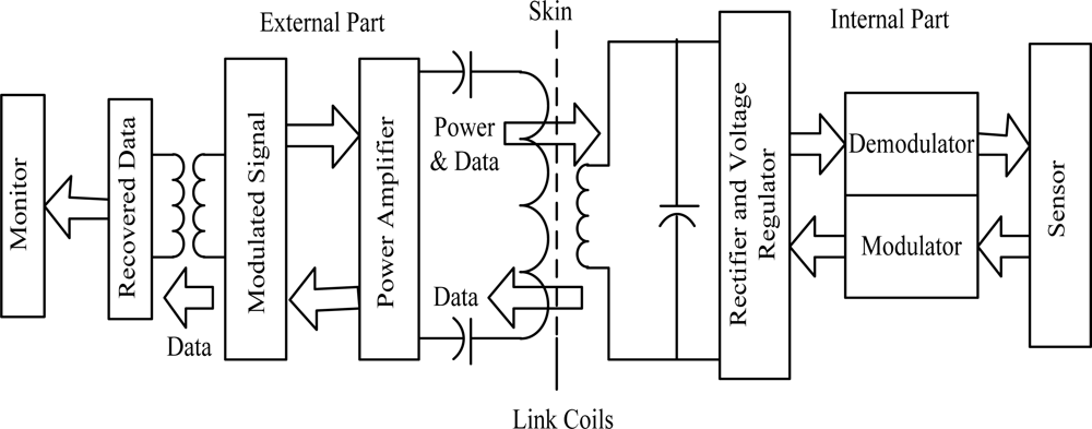 Biomedical device technology has been recently used for medical applications in the human body by monitoring or recording many signals such as EMG, ECG, EOG and ERG and monitoring or diagnosing the current conditions of implantable devices such as retinal implants, cochlear implants, pacemakers, brain implants and for wireless capsule endoscopy. Two of the most important issues for biomedical implants are patients’ safety and comfort. These can be achieved by reducing the power consumption, switching losses, choosing suitable modulation and carrier frequency according to a MICS table and by increasing the efficient energy transfer capabilities, for example, using near-field wireless energy transfer that results in electromagnetic fields that would not heat the tissues. However, for example, heating of pacemaker leads is the major problem undermining magnetic resonance imaging. Therefore, hundreds of patients with a pacemaker or implantable cardioverter face safety and reliability issues [,]. Typically a wireless biomedical devices consists of two parts, the external part that transmits RF signals to the internal part through an inductive coupling downlink using variety of modulated signals such as ASK, FSK, PSK (BPSK, QPSK, DBPSK, DQPSK, OQPSK), and it must transmit with high efficiency and low power consumption. Thus, an aim of research into implantable biomedical devices is to develop such devices with low power consumption, efficient energy transfer, the highest data rate, efficient power amplifiers, small size and low-cost, so many parameters need to be considered, as discussed in the following sections.