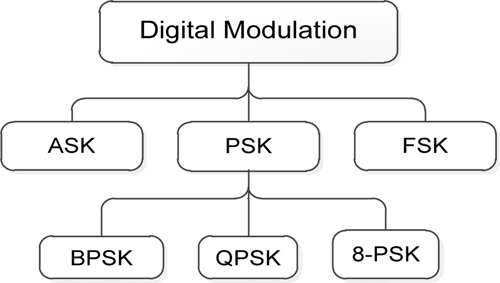 Digital modulation techniques impress the digital signal onto a carrier signal for data transmission. A sequence of digital data is used to alter the parameter of a high frequency called carrier signal. Thus, signal transmission takes place by modulating different parameters like amplitude, phase and frequency of the signal. Modulation techniques provide high data rate transmission, data security, quality signal, simple architecture, low power consumption, good performance over a fading communication channel, increased channel capability, greater accuracy in the presence of noise and distortion, etc. []. However, there are a number of tradeoffs in the digital modulation like hard to design complex structured, disadvantages of analog counterparts and bandwidth size. The main criteria for choosing the kind of modulation schemes are based on power, bandwidth and system efficiencies [,]. Figure 3 shows the most common modulation used in biomedical devices.