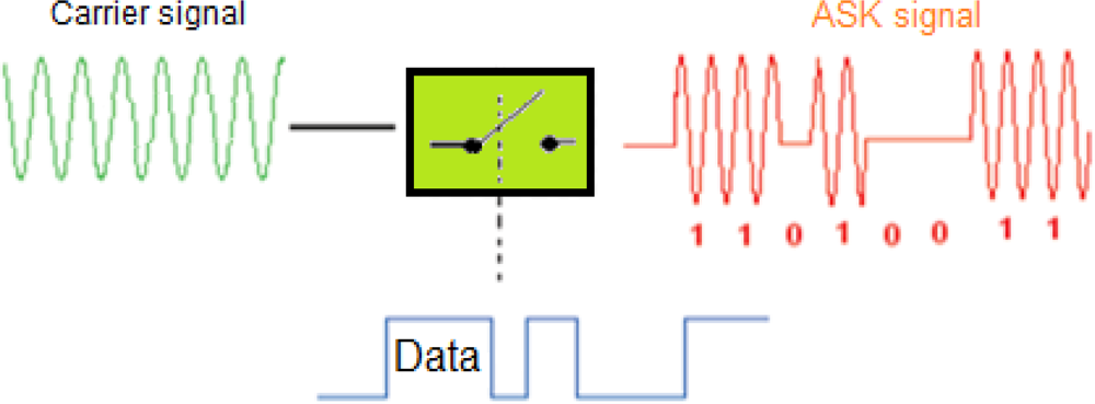 The amplitude shift keying (ASK) or on/off keying (OOK) is the simplest digital modulation used in wireless telemetry bio-devices and biomedical implanted devices []. In these types of modulation, no carrier is used during the transmission which minimizes the power consumption of the modulator []. The principle of ASK transmission is explained in [] as shown in Figure 4 and as follows: