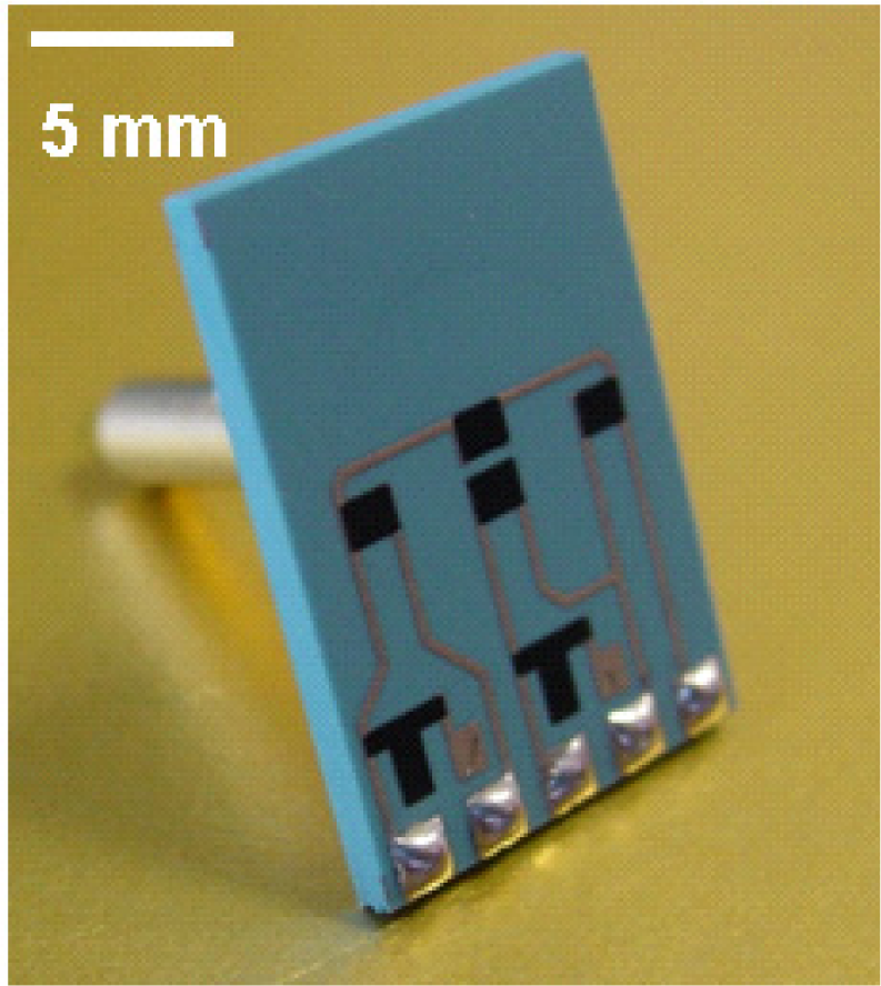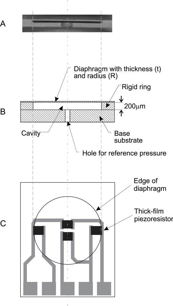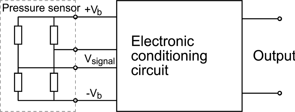 A piezoresistive ceramic pressure sensor (Figure 3) is based on the piezoresistive properties of the thick-film resistors that are screen-printed and fired onto the deformable diaphragm. The piezoresistive ceramic pressure sensor has four thick-film resistors, which act as strain gauges and transduce a strain into an electrical signal. The sensing resistors are located on the diaphragm so that two are under tensile strain, and two are under compressive strain. These four resistors are electrically connected in a Wheatstone-bridge configuration and excited with a stabilised bridge voltage. The Wheatstone-bridge is integrated with the electronic conditioning circuit in one single ceramic substrate (Figure 4).