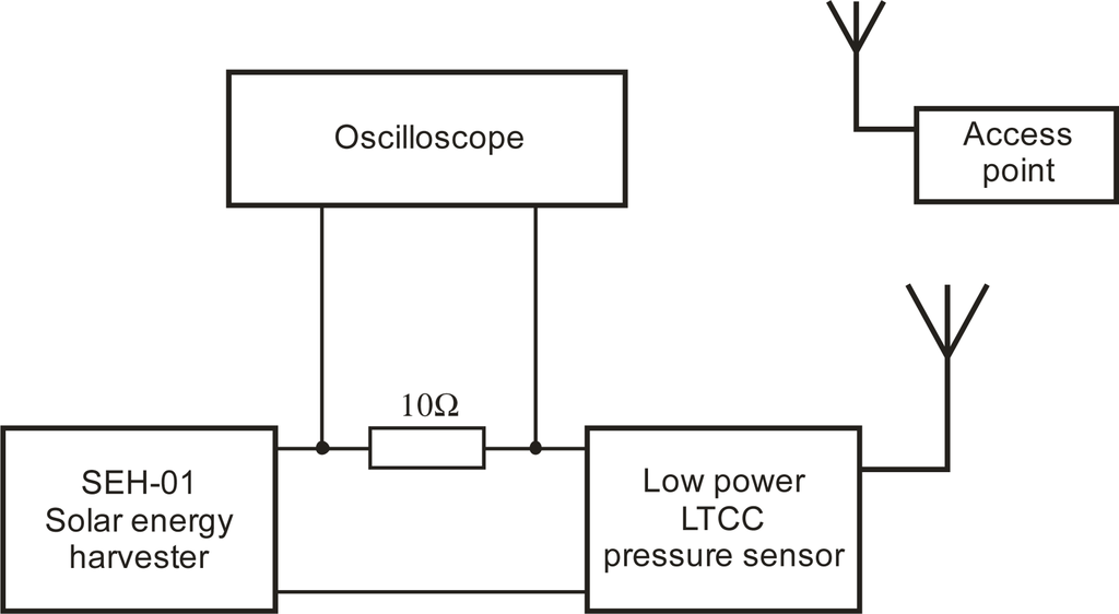The power consumption of the pressure-sensor module with an LTCC-based sensing element was calculated by measuring the voltage drop with an oscilloscope over the shunt resistor between the energy harvester and the sensor electronics.