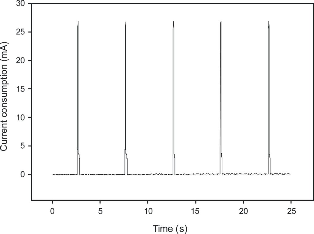 The diagram in Figure 12 shows the magnitude and duty cycle of the sensor’s power consumption. The average sleep-mode power consumption depends on the current draw between bursts. Increasing the time between the active periods could result in longer survival periods without any available power, e.g., when the ambient light conditions are dark.
