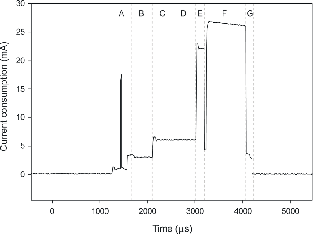 | Segment (Figure 13) | Event | Source | Current (mA) | Time (μs) | Energy (nAs) | Portion of power consumed (%) | |