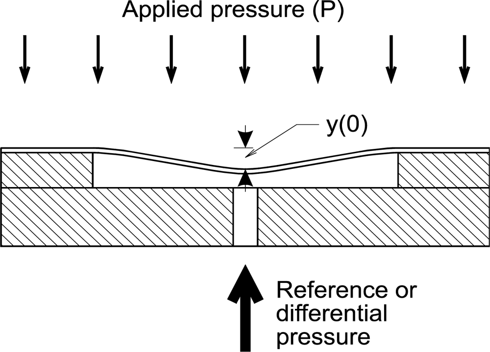 The capacitive ceramic pressure sensor (Figure 5) is based on the fractional change in capacitance induced by the applied pressure. The capacitance change is due to the varying distance between the electrodes of the air-gap capacitor. These electrodes are within the cavity of the LTCC structure (Figure 1). The bottom electrode of the capacitor is on the rigid substrate and the upper electrode is on the deformable diaphragm. The areas of the electrodes and the distance between them define the value of the initial capacitance (C0) of the capacitive pressure sensor. The distance between the electrodes is calculated from the cavity depth and the thickness of both electrodes.