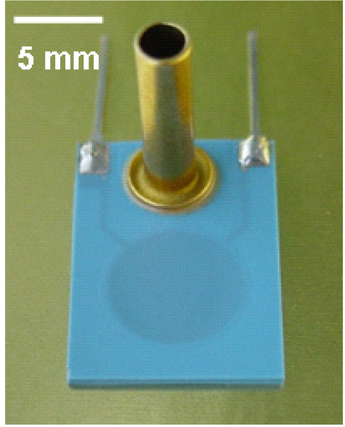 First, the general outline dimensions are defined. Within the given outline, the cavity supporting structure is constructed. The geometry depends on the required pressure range and assembling conditions. Generally, a sensor for high pressures requires more rigid supporting structure, and plastic housing also requires more rigid sensor element compared to a sensor packaged in an alluminium housing. When the membrane size is determined, the gap is calculated first from the capacitor calculation, and then a simulation is run using the estimated geometry. The design is optimized using simulations. Finally, a batch of different designs is produced and evaluated. For reference, a capacitive ceramic pressure sensor (as shown in Figure 6) with 80 μm air gap, 100 μm membrane and 1 cm2 electrodes/membrane area has nominal capacitance between 5 pF to 15 pF with capacitance change of 100 fF over 1,000 mBar full scale input pressure.