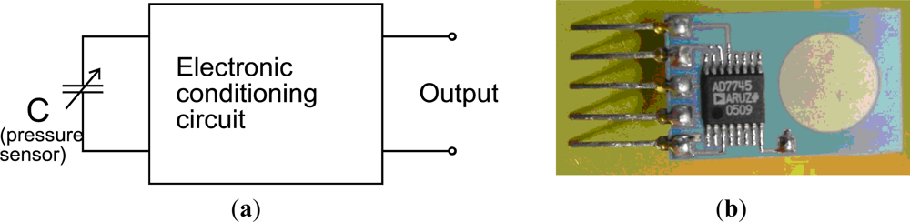 The capacitive ceramic pressure sensor is integrated with the electronic conditioning circuit with a frequency output in most cases (Figure 6). In this case the typical output frequency is between 10 and 100 kHz, and this varies according to the applied pressure. The power consumption of the sensing element for the capacitive ceramic pressure sensor is very low and depends mostly on the values of the operating frequency and the voltage, as well as the capacitance of the sensing element. Our test samples have a capacitance of around 8 pF, an operating voltage of 1 V, and an operating frequency of 10 kHz. These parameters result in a power consumption of about 0.5 μW. The power consumption was calculated from the impedance and the applied voltage. The values of working frequency and voltage are determined by the electronic signal-conditioning circuit. If we reduce the values of any mentioned parameters the power consumption of the sensing element is lower. But at the same time the pressure sensitivity is lower and the problems with the quality of the output signal and also with the parasitic capacitance are more serious.