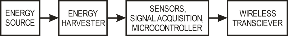 A typical energy-harvesting wireless-sensor node configuration usually consists of a (free) energy source, an energy harvester, sensors with ADC converters, amplifiers, a microcontroller and a low-power radio communication, as shown in Figure 7.