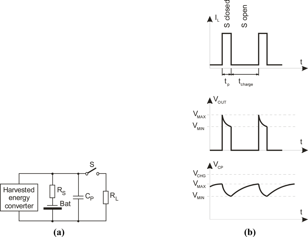 Each circuit system block in this chain has its own unique set of constraints. It is essential to design a high-efficiency harvester and power management to keep the amount of time required to power up the complete system to a minimum. Longer power-up times increase the time intervals between taking a sensor reading and transmitting this data. Proper design of a pressure sensor is of great importance here. Many conventional designs are not suitable for autonomous wireless sensors. Quiescent currents in individual blocks shown in Figure 7 define the lower usable limit of an energy-harvesting source. It must first supply the current needed for the system’s self-operation in sleeping mode before it can use any excess to supply and store this power to supply the outputs. A microcontroller with a periphery and RF link normally draws short pulse currents in the couple-of-tens-of-mA range when active. The energy-harvesting process collects available energy from the surrounding environment and stores it in an internal storage device [Figure 8(a)]. Some sources reported in [20] are listed in Table 2.
