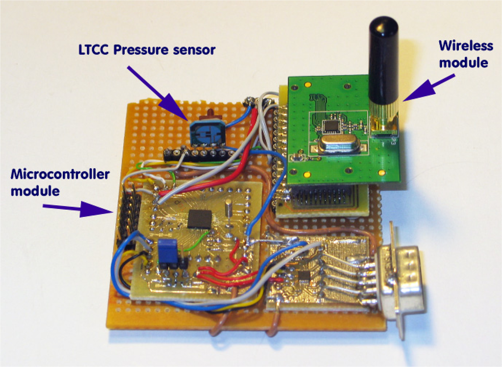 The wireless pressure-monitoring system built on a piezoresistive LTCC-based pressure sensor is shown in Figure 9. The data acquisition and processing were done with an MSP430F2350 microcontroller. The wireless interface was based on a CC2500 transceiver with TI’s simplicity low-power radio frequency (RF) communication stack. For real industrial application, proper housing is required with circuit layout redesign to accommodate the dimensions of a particular model, shown in Figure 10.
