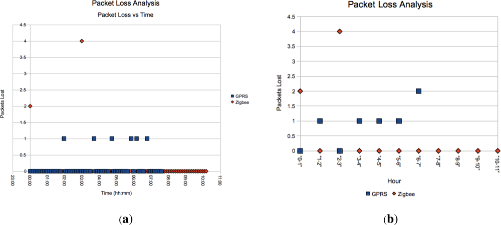 The 10% packet loss calculated using a sequence numbering scheme in the packets for the GPRS sensor, which is quite high, is in agreement with recent events in South Africa, where the mobile operators were fined heavily last year because 1 in 20 SMSs were not reaching their destination. This finding suggests moving to actually using GPRS as opposed to SMSs, due the exponentially lower cost of GPRS data links versus SMS messages and reliability mechanisms built into Internet protocols. However, the issue of availability of GPRS versus GSM in the target area must then be considered. The packet loss for the Zigbee sensor was also 10%. For the packet loss, Figure 11(a) shows where the packet loss occurred while Figure 11(b) summarises the instances into hourly bins. The distribution of the dropped packets for the GPRS is quite widely spread, as is to be expected, while the Zigbee is concentrated at the beginning and one anomalous instance.