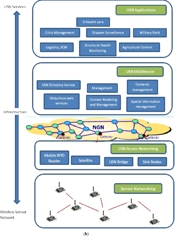 Figure 1(a) illustrates the schematic layers of a USN architecture proposed by ITU-T [6] while Figure 1(b) reveals the different features of our proposed USN4D architecture. In both architectures, four different layers are used to provide different services to different types of applications in a multi-technology, multi-devices and multi-protocol platform. They reveal (1) a sensor networking layer (the bottom layer) where sensor and RFID devices are launched into the environment to sense what is happening and report to sink nodes via USN-bridges (2) A USN access networking layer (the second layer) where the combination of USN-bridges and sink nodes are used as an access network for the first-mile connectivity of a Next Generation Network (NGN) of gateways (3) a USN middleware layer (third layer) used as an interface between the USN access network and the applications layer and (4) different applications which are embodied into a USN applications layer (the last layer) to perform tasks related to logistics, structural health monitoring, agriculture control, disaster surveillance, military field surveillance and disaster/crisis management.