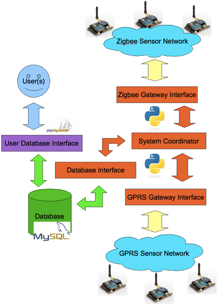 As implemented in the WaspNet Testbed, the model presented by Figure 3 includes the following open source software components implemented in Python and PHP: