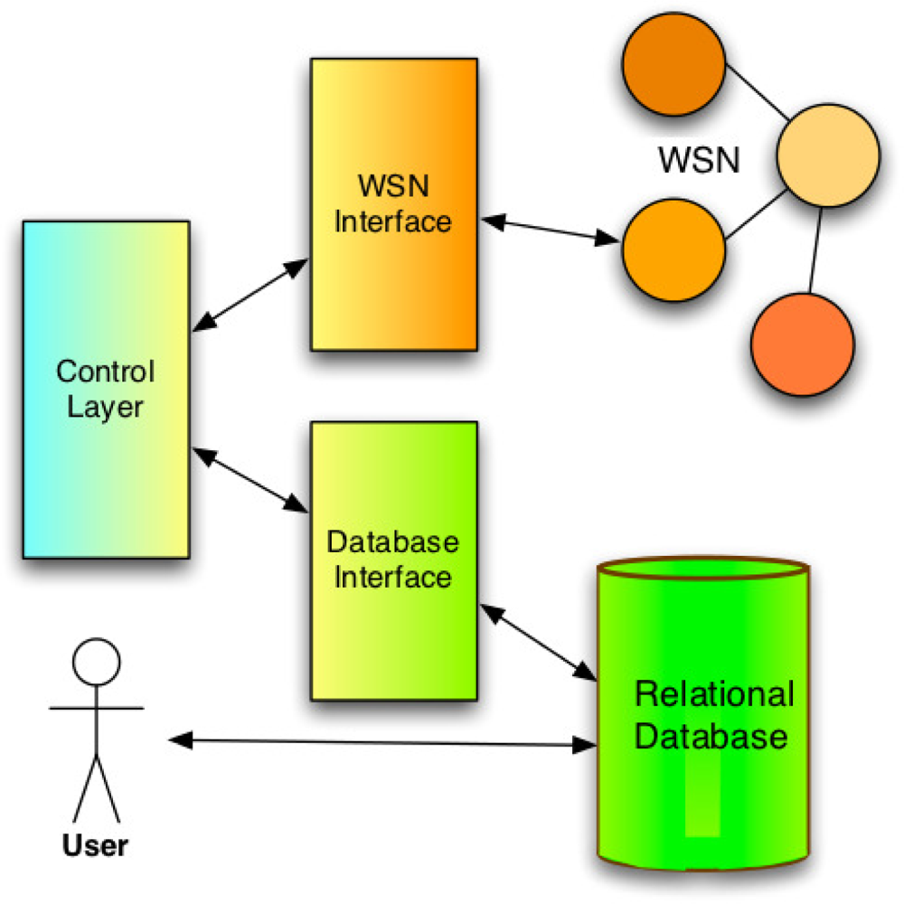 Control/Interface Layer that monitors the response from the relational database to the user. Trigger conditions can thus be set to be activated upon certain conditions and perform tasks. For example, when the timestamp of the data requested is too far in the past from the current time, the layer would in this case update the data in the database using the data from the WSN interface. Hence, this layer also can interact with the WSN interface, and use it to update the relational Database.
