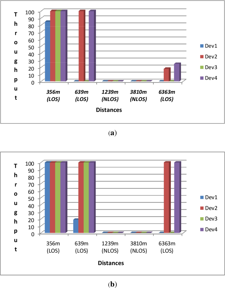 We also considered experimental results obtained over a period of 3 days using XBee Waspmote transceivers operating in the 2.4 GHz band. We wanted to check how far these different transceivers could go in terms of range and throughput when sending 100 packets of 90 Bytes each from a source node to a distant destination in both Line of Sight (LOS) and Non-Line-of-Sight (NLOS) for distances ranging from 356 m to 6,363 m. The results are summarised in Figure 6 for the 4 waspmote transceivers that use the 2.4 G frequency band as this is the ISM band which is license free in most of the developing countries. These transceivers are referred to as Dev1, Dev2, Dev3, and Dev4 in Table 2.