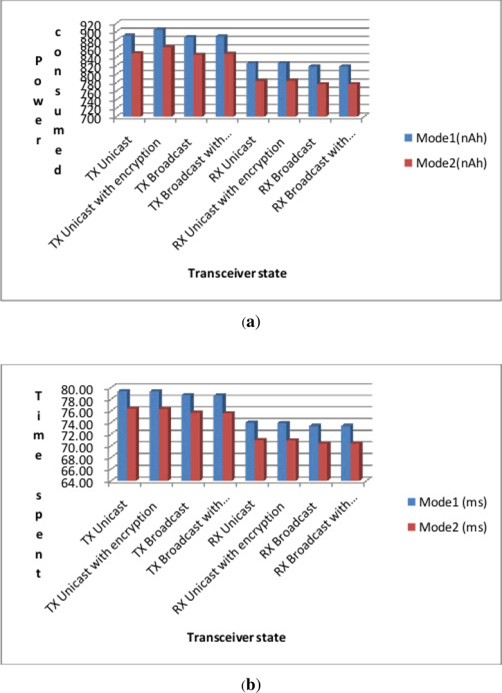 During the experiments we also made some measurements to assess the impact of encryption and its related security benefits on the power consumption of the Waspmotes. We used four different types of transmissions: (1) Unicast without encryption (2) Unicast with encryption (3) Broadcast without encryption and (4) Broadcast with encryption. Note that in these experiments, we measured the time and energy consumption from the OFF to ON mode referred to as “Mode 1” and from the SLEEP to the ON mode called “Mode 2” with the objective of evaluating what is the best energy saving mode for a possible synchronisation algorithm. In case of a unicast transmission the protocols waits for an ACK signal, while in case of broadcast there is no ACK. However, in broadcast mode each packet is always sent three times. The encryption (AES 128b) does not add any consumption due to the fact that it is performed using specific hardware circuits included in the XBee card and not in the software layer. The results summarised in Figure 7 reveal that (1) Mode 1 is more power consuming than Mode 2, (2) encryption and its related security benefit does not come at the price of a high cost in terms of power consumption, and (3) the time spent by Waspmotes in Mode 1 is higher than than the time spent in Mode 2. This suggests the implementation of security strategies that favour the second mode to save on energy consumption and processing time.