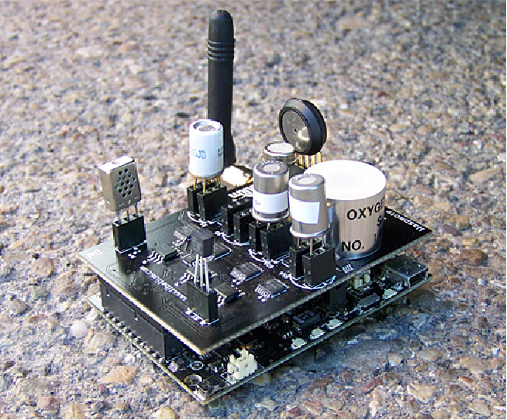 The Waspmote gases sensor board depicted by Figure 8 has been designed to monitor environmental parameters such as temperature, humidity, atmospheric pressure and 11 different types of gases. It allows the inclusion of 6 gases sensors at any one time, the regulation of their power through a system of solid state switches and the amplification of the output signal through a controllable amplifier. The gases which can be monitored are (1) Carbon Monoxide CO; (2) Carbon Dioxide CO2; (3) Molecular Oxygen O2; (4) Methane CH4; (5) Molecular Hydrogen H2; (6) Ammonia NH3; (7) Isobutane C4H10; (8) Ethanol CH3CH2OH; (9) Toluene C6H5CH3; (10) Hydrogen Sulphide H2S; and (11) Nitrogen Dioxide NO2.