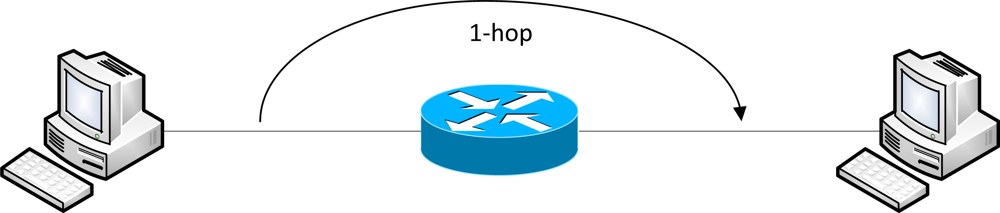 According to [22,23], the hop count refers to the number of intermediate routers the data will pass through, which clears the misconception that a direct connection between a point-point link in a transmission path is a 1-hop connection. A direct connection does not go through an intermediate router, and thus, it is not a 1-hop connection. However, when an intermediate router exists between them, this can be regarded as 1-hop connection. Figure 1 shows a simple 1-hop connection.