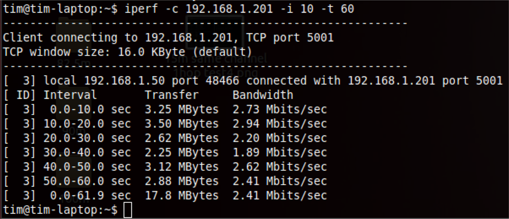 In the first three tests, each range was evaluated with 8 trials, and an average value was calculated to ensure the consistency of the results because the tests were performed outdoors where a significant amount of interference exists. Each trial was run for 60 seconds with a 10-second interval as the input to the iperf. The sample bandwidth results are shown in Figures 9–11. The results were then tabulated and compared.