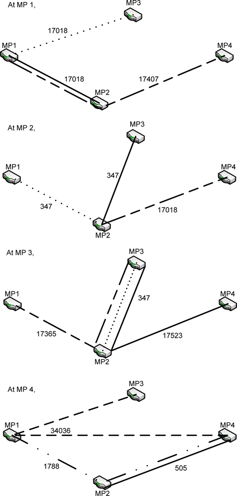 In the second trial of the last test, as shown in Figure 13, the inefficient paths were chosen again, as observed from the information obtained at MP3 and MP4. Similar results were observed for the MP1, MP2 and MP3 but worse paths were selected at MP compared to the previous trial. MP4 communicates with MP2 through MP3, and MP3 communicates through MP1. These two paths are obviously not the best paths because they require travelling a longer distance and an additional hop, compared to the direct path.