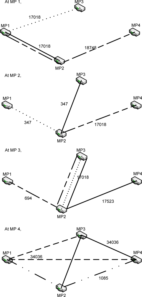 The routing information was obtained from each node after they were run with the established paths. This information was then visualized in diagrams, and the path chosen at each node is represented by different line types—the straight line, dotted line or the dashed line—as stated below. The value beside the line represents the metric value obtained from the test.