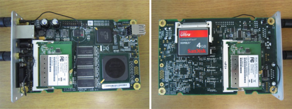 A picture of the embedded system with two wireless network cards and an installed CF card is shown in Figure 2 below.