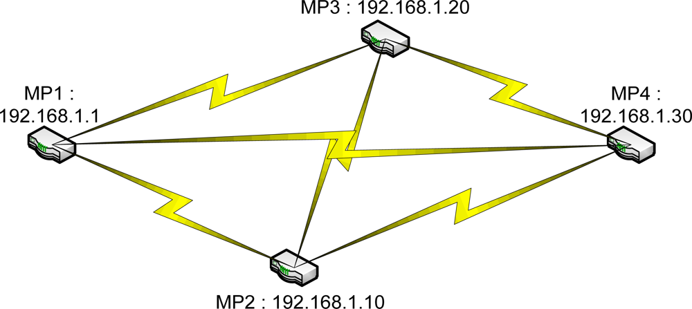 In the last test, which used dynamic routing to analyze the path chosen by the routing protocol implemented in the FreeBSD 802.11s implementation, the embedded systems were placed in a simple mesh topology in which the distance between MP1 and MP4 is approximately 60 m, and the distance between MP2 and MP3 is approximately 10 m. Two trials were performed to analyze whether the path changes over time.