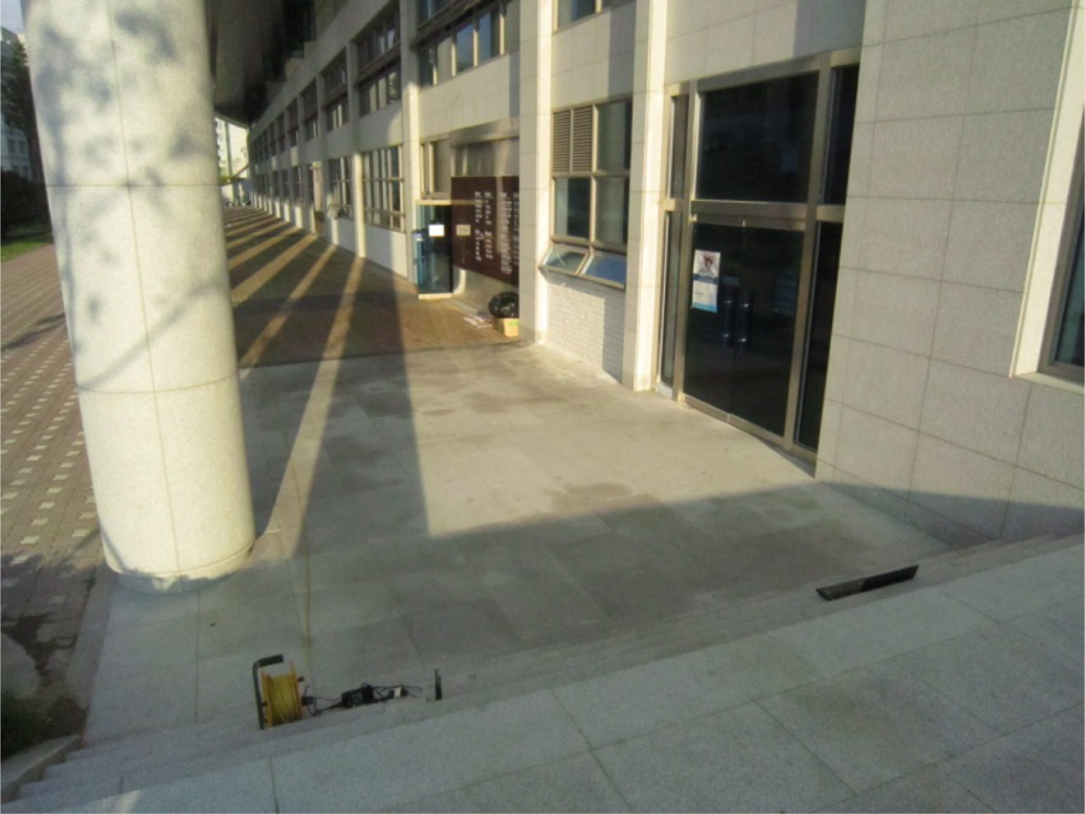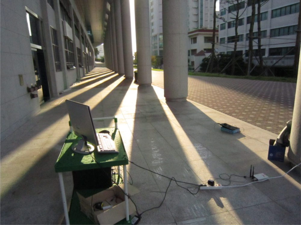 The last two tests were performed to show the path selected by the FreeBSD IEEE 802.11s implementation in the default mode or the dynamic routing mode instead of the static routing used in the previous tests. A simple mesh topology was used to evaluate the path selection mechanism of the 802.11s implementation as shown in Figure 5. The photos of the field test indicate the location of each MP and station (Figures 6–8).