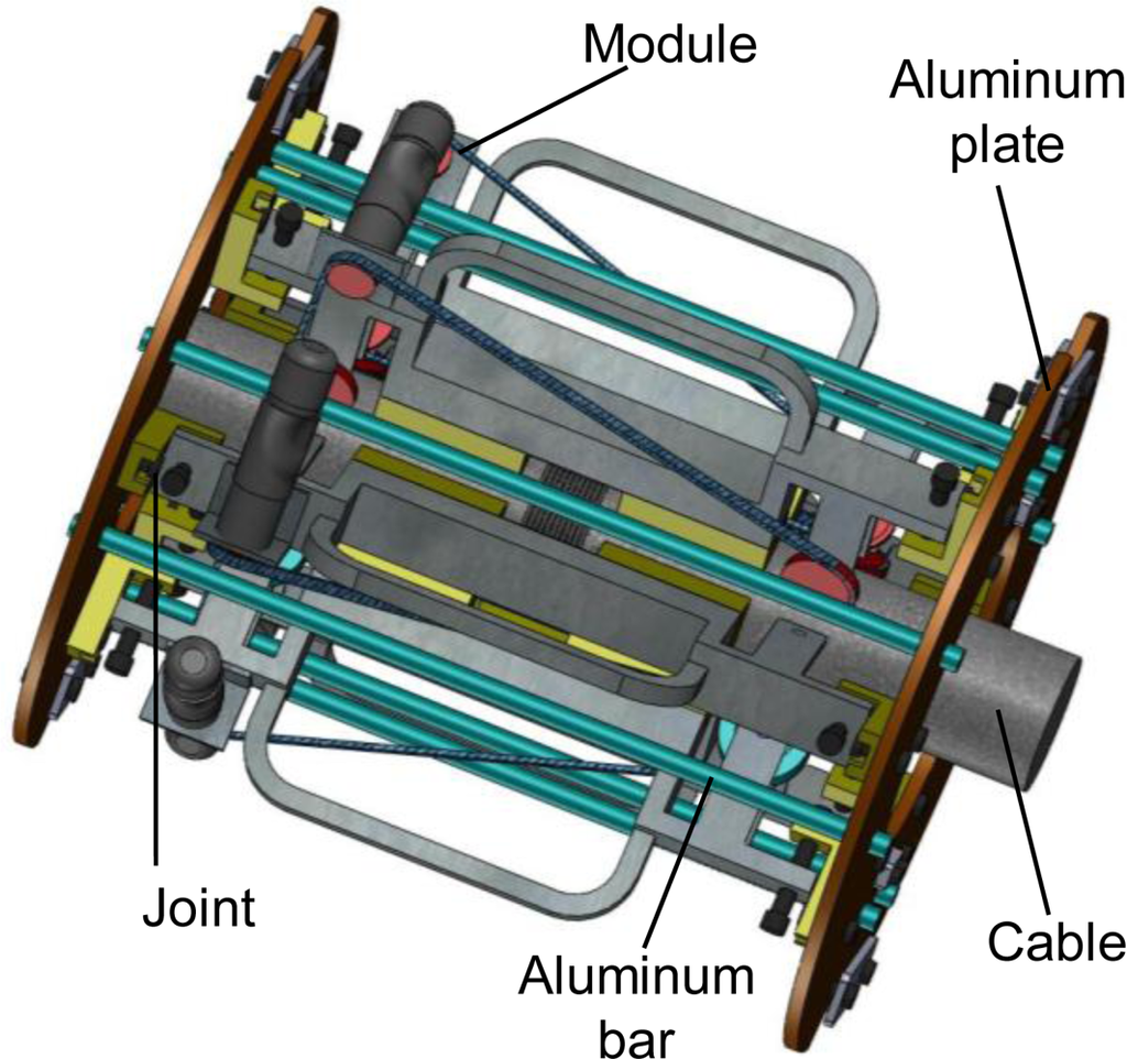 The climbing structure consisted of a framework of aluminum and several climbing modules. According to the cable diameter, the number of modules was selected to form the climbing structure. The climbing module was made up of a magnetizer, two wheels and a drive mechanism as shown in Figure 9. As mentioned in Section 3.1, the magnetic force would be produced between the permanent magnet and the cable. Wheels were made of synthetic rubber to increase the friction. The wheels were driven by an electromotor and a chain. Three factors should be considered by choosing the number of modules: the cable diameter, the attraction and the magnetization. Based on the above analysis, the structure of the transducer is shown in Figure 10.
