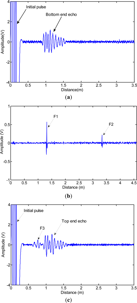 The testing process and the results are as follows. First, the transducer was installed at 1.2 m away from the cable bottom. The bottom anchorage zone of the sample cable was detected by MGW testing. The optimum frequency of the tone burst was 80 kHz with three cycles, and the first longitudinal mode guided wave (L(0,1)) was produced. The data is shown in Figure 15(a). The first signal was the initial electromagnetic pulse. The second signal was the echo from the filled epoxy-coated strands and the cable bottom. The echoes of F1 and F2 could not be observed in Figure 15(a). Second, the free length of cable was detected by MFL testing from 1.2 m away from the cable bottom to 1.2 m away from the cable top; the data is shown in Figure 15(b). The peak-peak value of F1 was 0.88 V and the peak-peak value of F2 was 0.34 V. The locations of detected flaws, F1 and F2, were about 2.518 m and 4.505 m from the bottom of the cable, respectively. Lastly, the transducer stopped at 1.2 m away from the cable top. The top anchorage zone of the sample cable was detected by MGW testing; the data is shown in Figure 15(c). The location of detected flaw, F3, was about 0.593 m from the top of the cable. The positioning error of F3 was about 1.2%. Likewise, the echoes of F1 and F2 could not be observed in Figure 15(c). The results indicated that F1 and F2 were too small to be detected by MGW testing.
