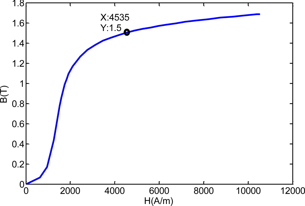 Firstly, we studied the magnetic flux density to meet the needs of MFL testing. The magnetization curve of the cable was used to determine the magnetic flux density. The experiment was carried on a parallel wire cable with 163 × 7 mm wires, with 114 mm diameter, 7 m long, 8 mm thick HDPE sheathing. The experiment system for obtaining the magnetization curve is provided in Figure 5 [38]. The magnetization curve of the cable is shown in Figure 6. When the magnetic flux density of the cable was larger than 1.4 T, the cable was in the near saturation state. Considering the testing requirement of inner defects, the magnetizer should provide at least 1.5 T under the detector to satisfy the requirement of MFL testing. Due to the effect of the demagnetizing field, the magnetization curve of the cable with a different diameter needs to be modified.