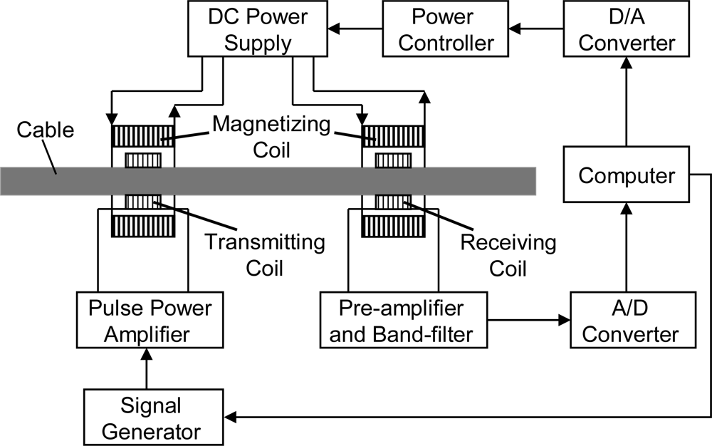 As mentioned above, the similarities of the two NDT methods are that they both need an axial static magnetic field to magnetize the cables and a magnetic sensor to induce the axial varying magnetic field. The differences are that MFL testing requires a near saturated static magnetization state and MGW testing demands an appropriate static magnetization state. The operation frequency of MFL testing is lower than that of MGW testing. In addition, MGW testing needs the transducer to produce a high power axial varying magnetic field.