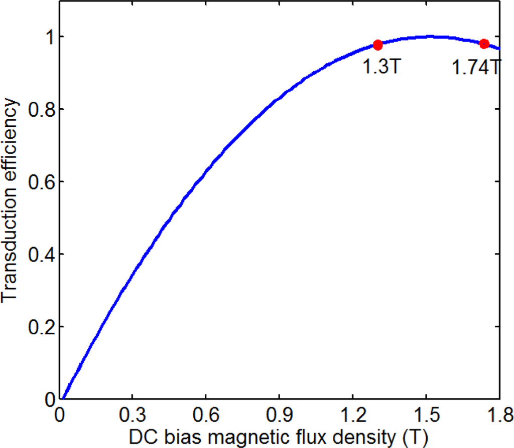 The transmitter included two coils; one provided the bias magnetic field and the other provided the high power varying magnetic field. The receiver also included two coils; one provided the bias magnetic field and the other induced the change of the magnetic field. The directly passing signal was applied to evaluate the transduction efficiency. A hall sensor was employed to detect the magnetic strength near the surface of the cable. The magnetic flux density was obtained from the magnetization curve. The optimum frequency of the tone burst was 80 kHz, and the first longitudinal mode guided waves (L(0,1)) was produced. The normalized relation of the transduction efficiency with the magnetic flux density is shown in Figure 8. We made the assumption that the transduction efficiency should be 98% maximum. The magnetic flux density of the cable was about from 1.3 T to 1.74 T corresponding to the assumption. The relation of the transduction efficiency with the magnetic flux density is different in the parallel wire cable with a different diameter. Therefore, the relation should be renewed in the cable with a different diameter.