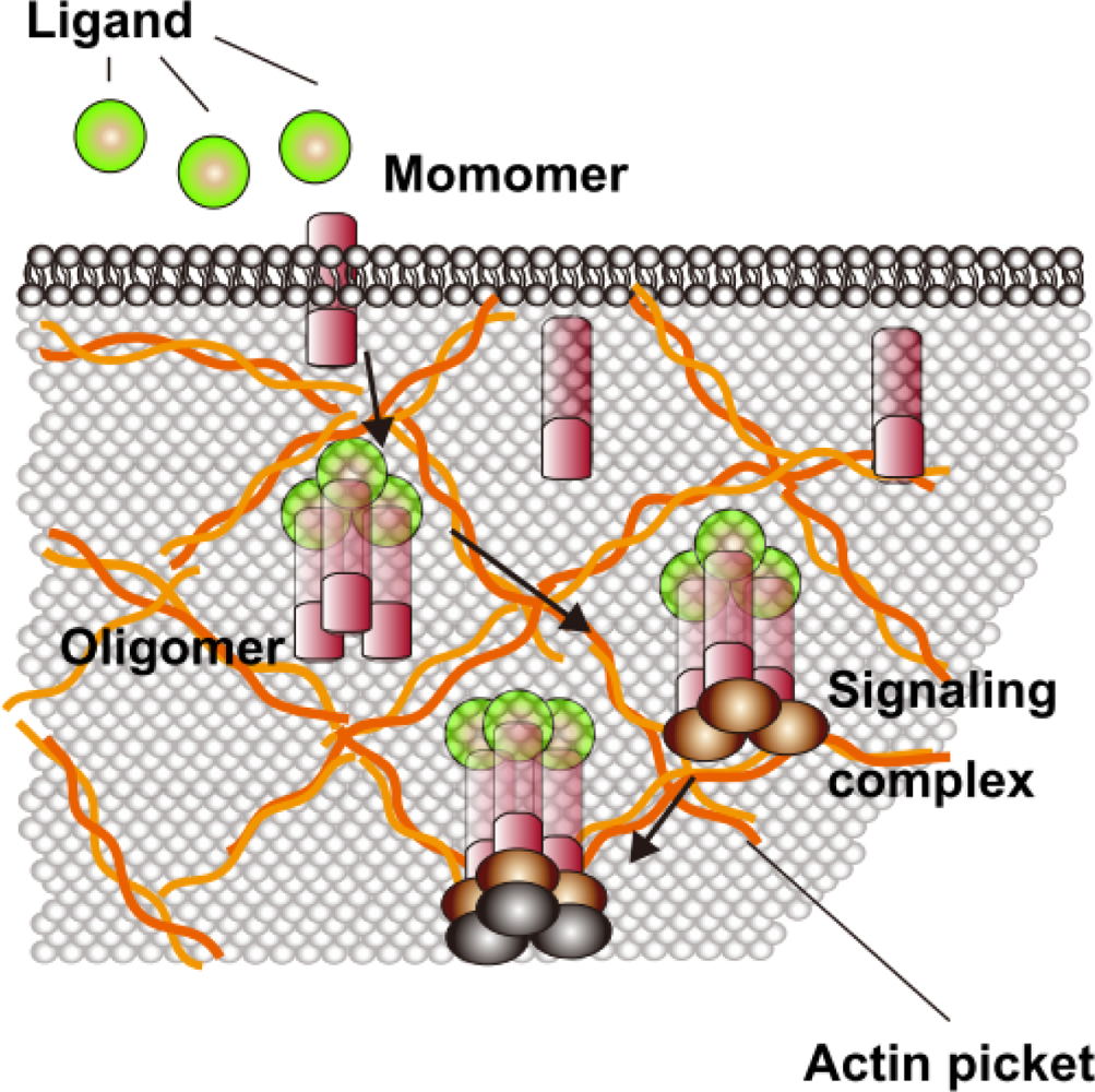 To this end, a receptor molecule moves very rapidly within a compartment for a few seconds or more on average, and then hops to an adjacent compartment. Therefore, macroscopic diffusion of receptor molecules occurs as a result of a series of steps involving intercompartmental hop diffusion. This model of a “membrane skeleton fence” has now been widely accepted. Membrane skeleton-induced diffusion barriers appear to be important for maintaining spatial information for signals from the receptor molecules. For example, when an extracellular signal is bound to a receptor monomer and it forms oligomers, this formation would induce a dramatic decrease in the diffusion rates of such signaling complexes because of the enhanced effects of corralling or binding to the pickets and fences, and these signaling complexes would immediately be arrested within the compartment when it receives a signal (the oligomerization-induced trapping model) (Figure 2) [77,78,80,81]. Such an arrest may be the basis for the spatial distribution of a certain receptor after it receives a signal.