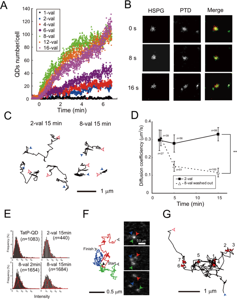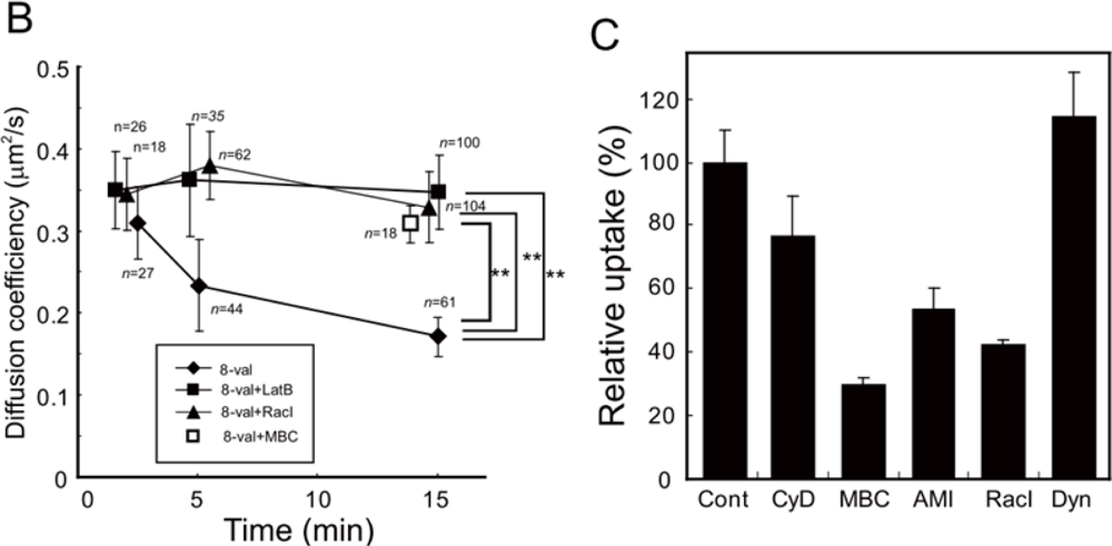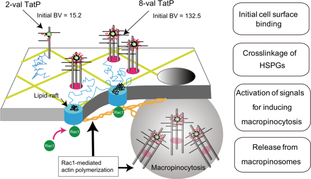 Full-length Tat protein exposure activates Rac1, a GTP-binding protein that regulates membrane actin polymerization [57]. We hypothesized that the crosslinking of HSPGs by 8-val TatP causes the recruitment and activation of Rac1 adjacent to the lipid rafts and the membrane actin near the raft domains, and regulates membrane actin polymerization, resulting in reducing the diffusion of TatP-QD/HSPG and also activating some mechanisms for taking up TatP-QD/HSPG from the cell surface.