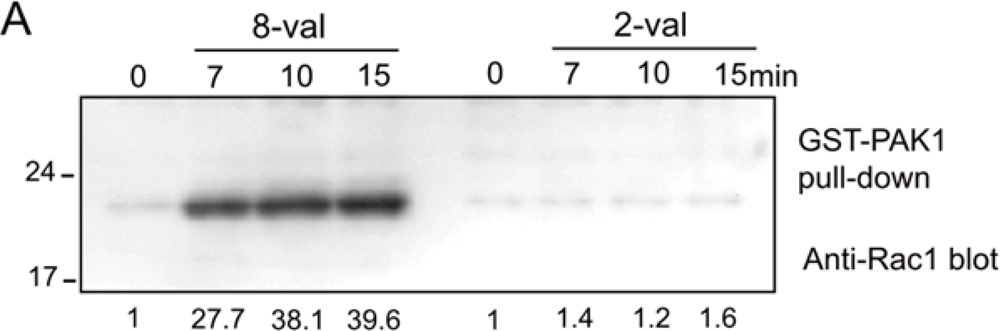 We first measured the amplitude and the time course of Rac1 activation in the cells exposed to 2-val and 8-val TatP and found that 8-val TatP-QDs activates Rac1 within 7 min of exposure, continuing until 15 min of exposure. In contrast, the induction of Rac1 activation was marginal in cells that were exposed to 2-val TatP (Figure 4(A)). Furthermore, Rac1 was found to be clustered with TatP-coated beads and not with uncoated beads, confirming that the crosslinking of HSPGs by 8-val TatP recruited Rac1 to the membrane. We also studied the mobility of individual 8-val QDs in cells that were pre-exposed to NCS23766, a Rac1 inhibitor (Figure 4(B)). We found that the reductions of average diffusion and the induction of STALL-like events were suppressed by the Rac1 inhibitor. The gradual increase in the number of the spots>2 QDs over time was also found to be significantly suppressed by the inhibitor.
