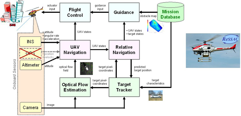 Unmanned Aerial Systems (UAS) can be devoted either to military or to civil missions, such as monitoring of boundaries, crop surveying, and search and rescue at disaster sites [1–6]. For this reason, there has been a remarkable flurry of research concerned with increasing the level of autonomy of UAS, thus allowing them to perform fully autonomous vision-based take-off and landing, and collision avoidance [7–9]. In this framework, the ONERA French national aerospace research center carries out the ReSSAC (Search and Rescue by Cooperating Autonomous System) project [10]. The main objective of this project is to implement a vision-based navigation and target tracking system onboard an unmanned helicopter that has to fly in an unknown urban environment.