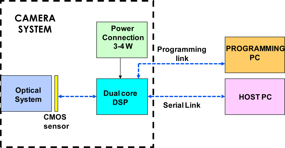 Indeed, the electronic camera system is composed by two more electronic boards, such as a processor and a Power Control Unit (PCU). The particular processor (Blackfin family, model ADSP BF561) is manufactured by Analog Device [28]. It is composed by dual symmetric 600 MHz high performance cores and 328 K of total on-chip memory (L1 memory). Moreover the processor has a more internal L2 memory of 128 K and Direct Memory Access (DMA) controllers which provide the access to the 120 MHz Static Random Access Memory (SRAM) off-chip memory of 64 MB (L3 memory). That ADSP system is connected to two computers: one is dedicated to the algorithm development; the second is the host computer which communicates with the ADSP by means of the serial link and controls the algorithm execution and configuration (sensor exposition time, acquisition duration). Figure 4 illustrates the laboratory test system scheme.
