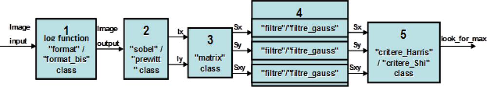 The corner detection algorithm has been developed in Visual DSP C++ language. Its main purpose is to reduce the computation time at less than 60 ms, also at large image resolution (VGA mode). Figure 5 illustrates the blocks diagram of the implemented algorithm. Thus, the reader can observe that the algorithm consists of six blocks, each one of which has a specific function and corresponds to a C++ class. Classes’ characteristic names are: “format”/“format_bis”, “sobel”/“prewitt”, “matrix”, “filtre”, “critere_Harris”/“critere_Shi”. Hereinafter each function is described in detail.