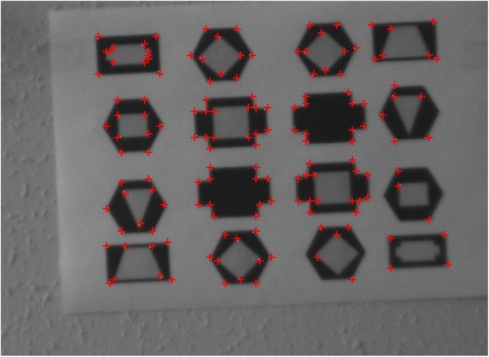 Figure 7 shows an example of the algorithm implementation on the test image of Figure 6 in VGA format setting the parameters described in Table 3. In this case we have asked the algorithm to find 150 points, more than algorithm requirement, in order to make outputs more clearly visible to the reader. Indeed, detected points are indicated by red crosses; therefore the reader can observe that all of them correspond to corners of the represented geometric figures. Flight tests in real scenarios will of course introduce additional noise effects. However, vibration effects will be significantly reduced by the camera isolation structure and the attitude control system.