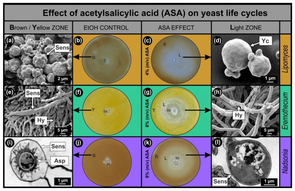 Lipomyces yamadae was suspended in sterile distilled water (dH2O), whereafter 200 μL of the suspension was spread out on YM agar plates. Central wells were made in the plates with sterile Pasteur pipettes. To these wells 46 μL of either 4% or 8% (m/v) acetylsalicylic acid (ASA; Sigma-Aldrich, Steinheim, Germany) dissolved in 96% ethanol (EtOH; Merck, Darmstadt, Germany) were added. An EtOH control was included []. All plates were incubated for 11 days at 25 °C. The same technique was used to prepare the L. yamadae bio-assay after one year of preservation.